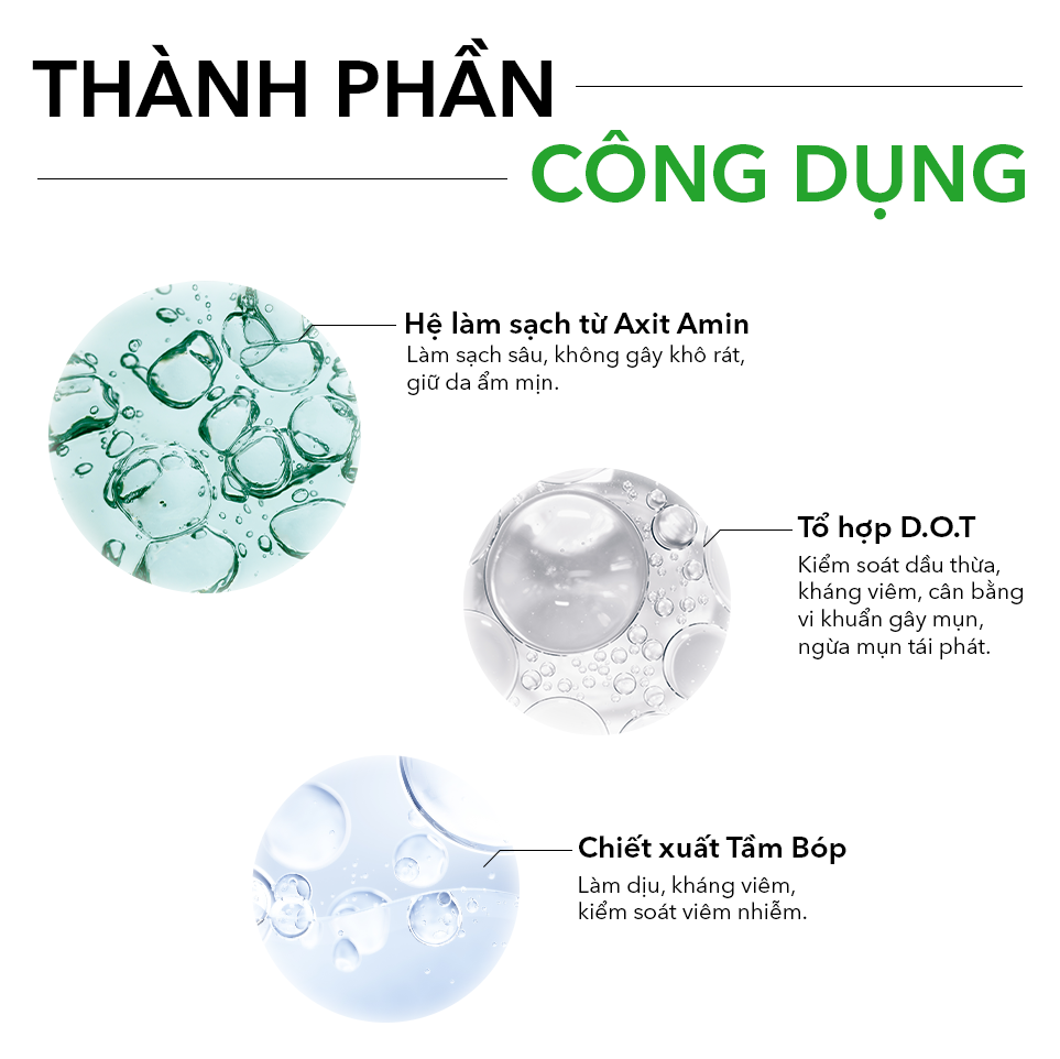 - Tổ hợp D.O.T: tác động cùng lúc vào 4 cơ chế hình thành mụn (kiểm soát dầu thừa, tẩy da chết dịu nhẹ, tái cân bằng hệ vi khuẩn gây mụn, làm dịu viêm) từ đó hỗ trợ giảm mụn ngay từ bước làm sạch.